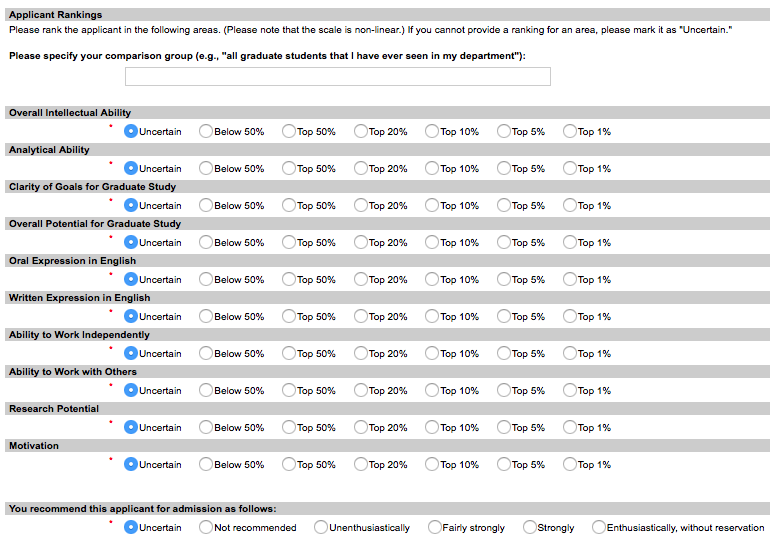 How well did you perform in their class? Consider not only your letter grade, but also your class rank. Why is this important? Because schools ask letter writers to rank applicants relative to their peers. Click here for a sample of what this grid typically looks like.