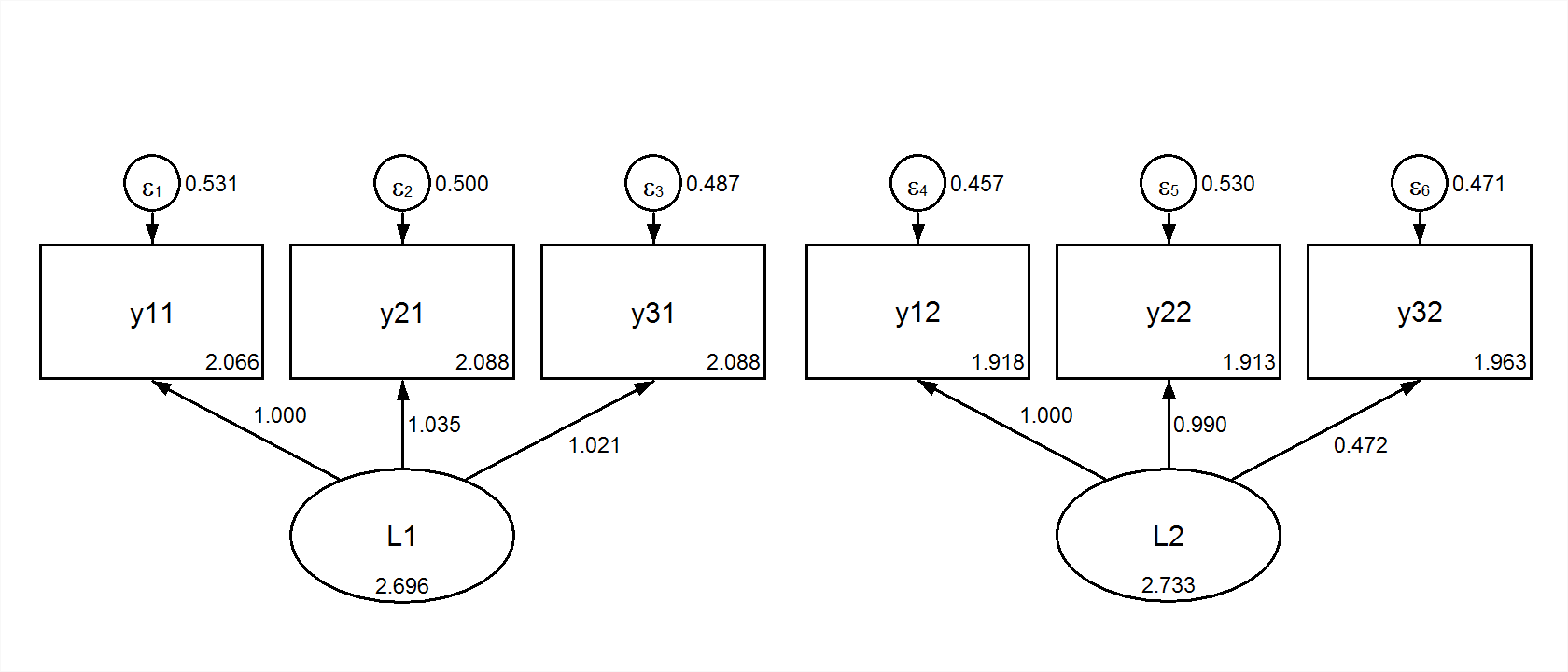 The default model is a scalar model, one in which we assume that measurement paths and measurement intercepts are equal across groups (but not necessarily tau-equivalent). Note that factor means are free to vary. To identify the model, the first factor mean is fixed at zero, and the first measurement paths are fixed at one.