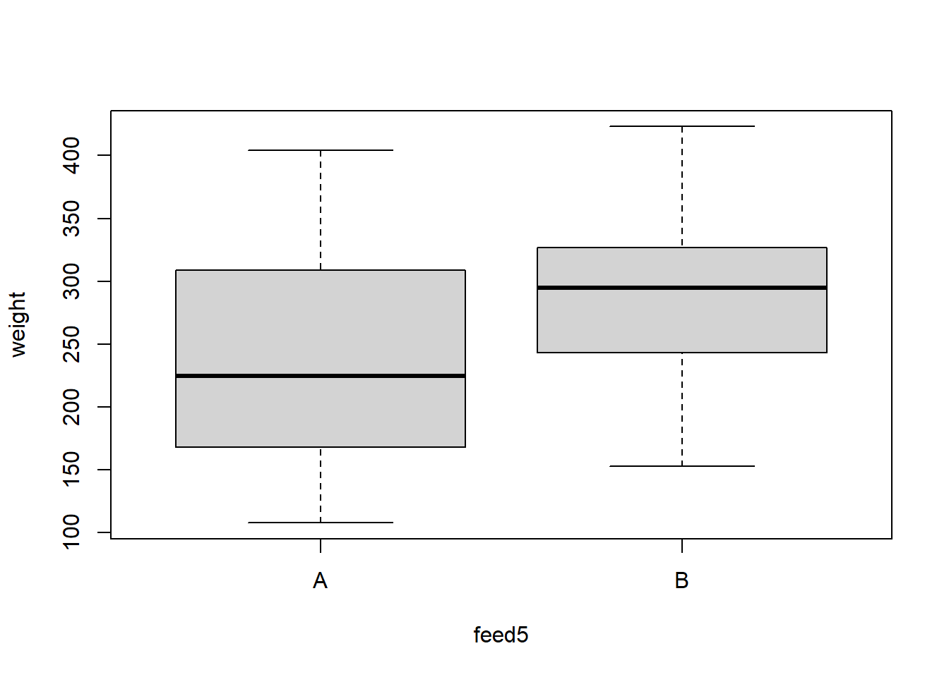 plot(weight ~ feed5, data=chick)