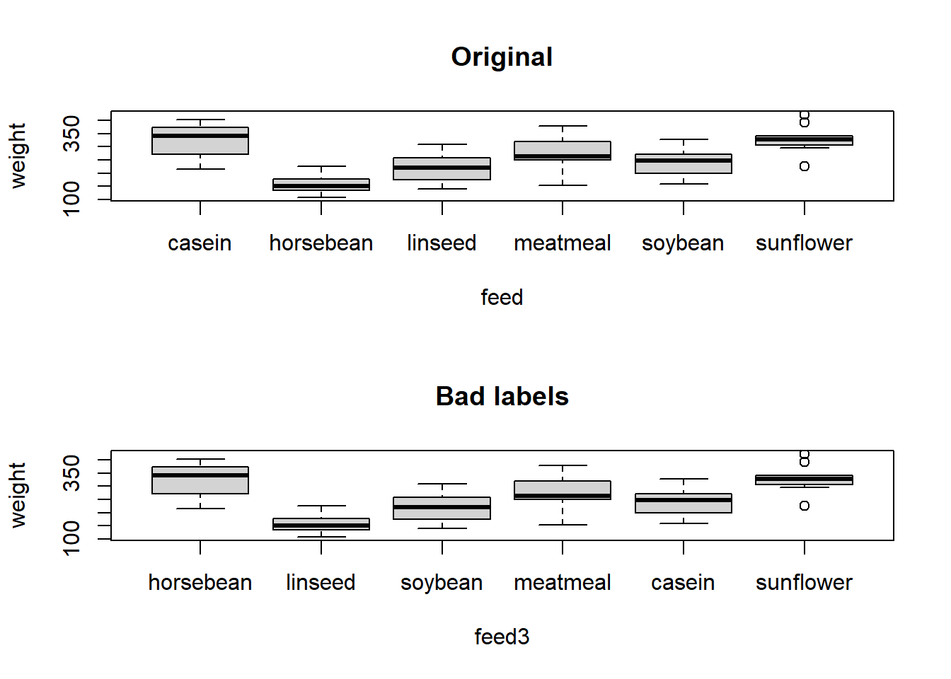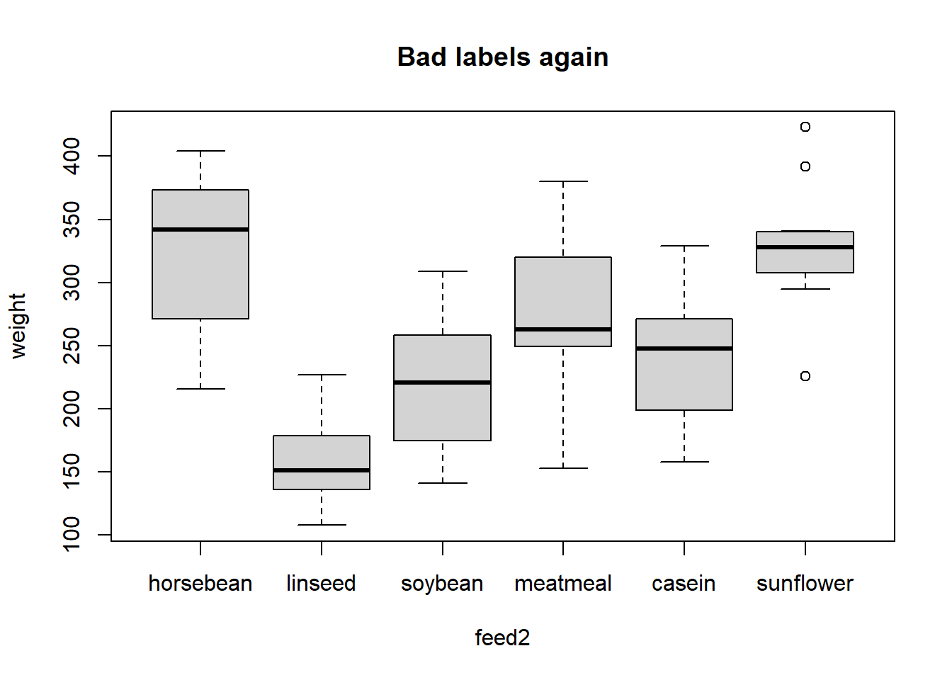 plot(weight ~ feed2, data=chick, main="Bad labels again")