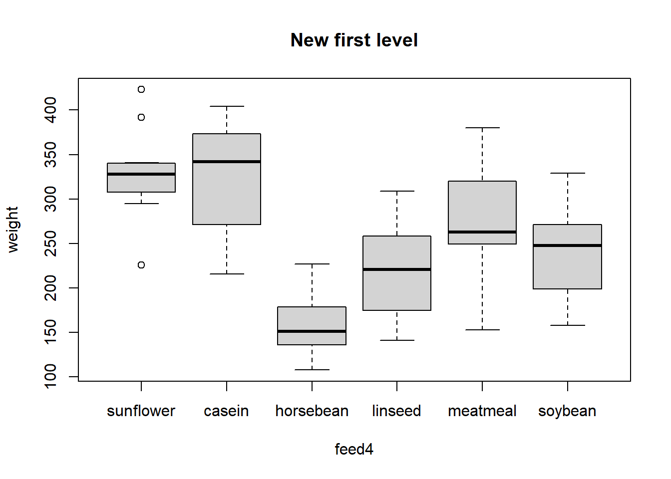 plot(weight ~ feed4, data=chick, main="New first level")