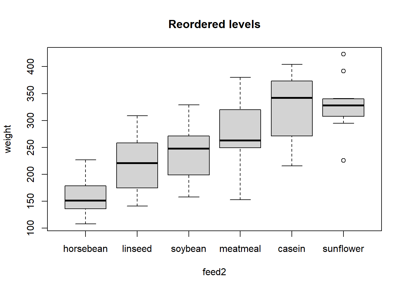 plot(weight ~ feed2, data=chick, main="Reordered levels")