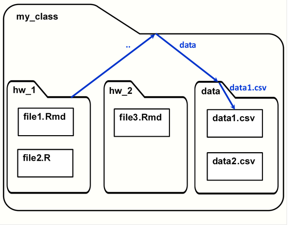 In the image above, if your working directory is the folder hw_1, you can reach the data1.csv file with the path “../data/data1.csv”. This path could be given to read.csv() (or another data-reading function) to read in the data, or to write.csv() to write over the file.