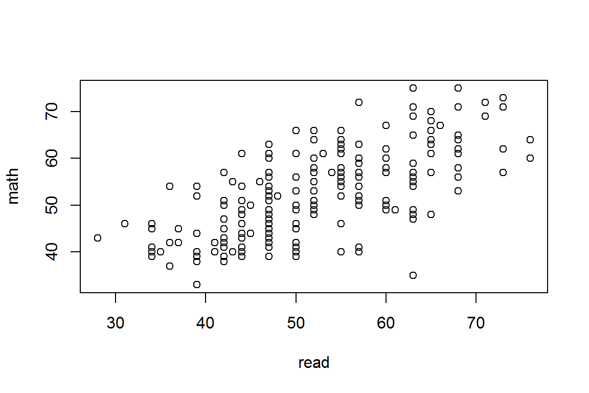 For example, a scatterplot can be specified as a formula within the plot() function. Where we can specify the relations between variables using a formula, we can almost always also specify a data= parameter to point to the source of the variables.