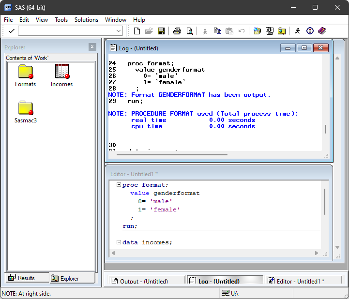- the variable GENDER is assigned value labels from GENDERFORMAT in the DATA step.
