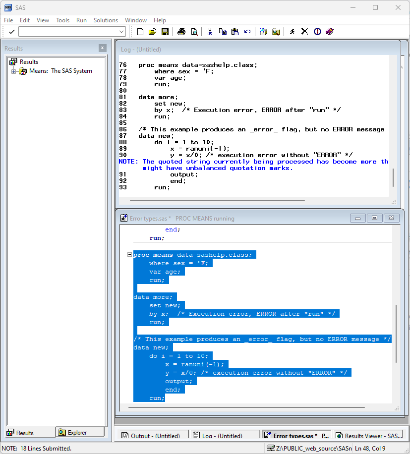 By syntax errors we mean any error that produces code that SAS cannot interpret. These range from simple typos, to mismatched quotes, missing semi-colons, and misused SAS keywords. These are all compile-time errors.