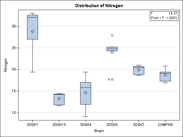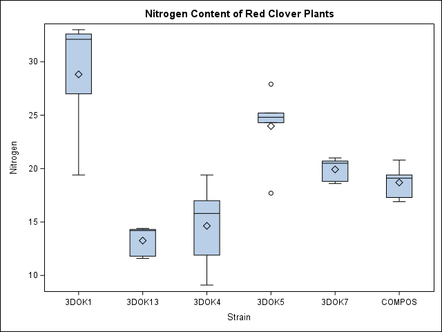 In this example, note that strain is a character variable, so the category order is alphabetic order. Reorder them with informats and formats.