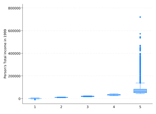 The result will be an ordered categorical variable, frequently used for grouping with the by prefix or with over() in graphs. For example, you can create a box plot of income over the five quintiles with: