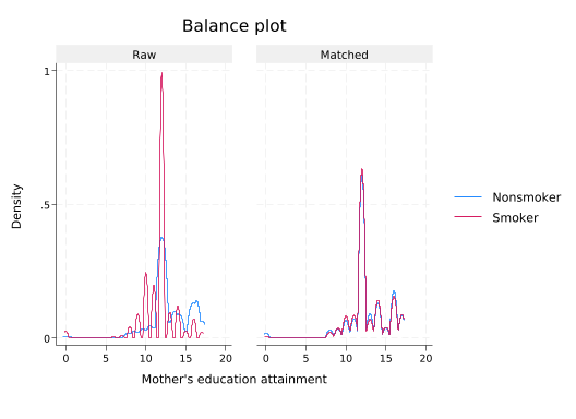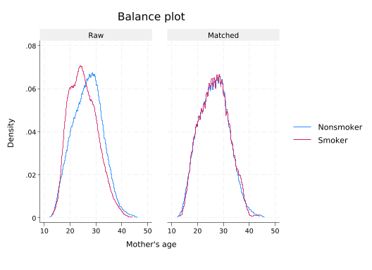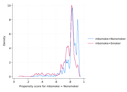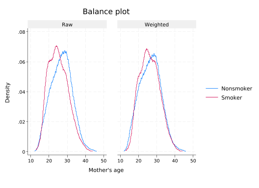 The cattaneo2 data set (used in Stata’s documentation and thus available via webuse) contains data on women’s pregnancy outcomes. The question at hand: does smoking during pregnancy lower birth weight?
