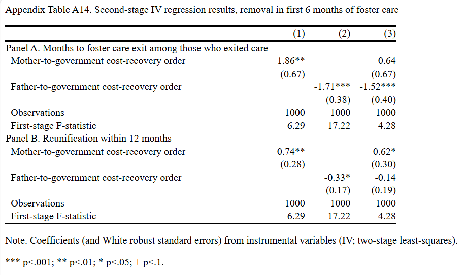 Appendix Table A14. Second-stage IV regression results, removal in first 6 months of foster care