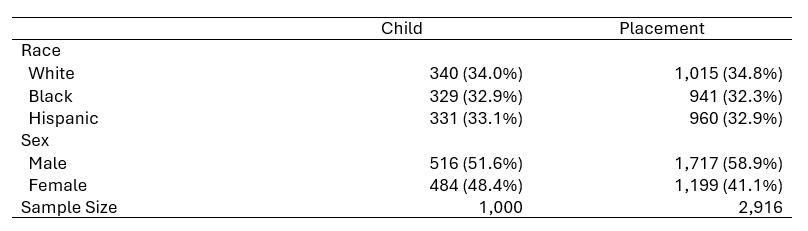 Better, but the percentages on Sample Size are misleading. The child-level statistics are not really 34.3% of the placement-level statistics.