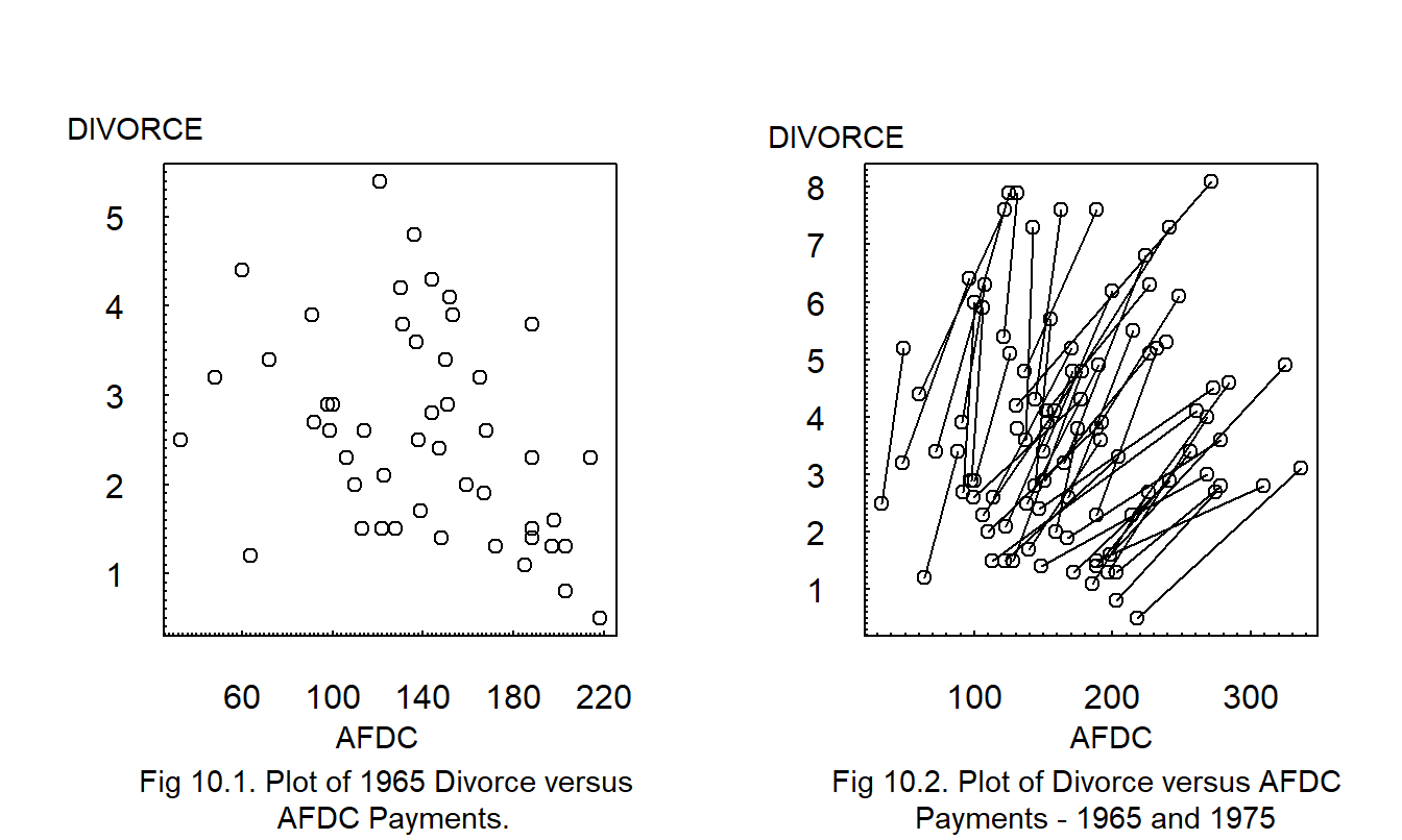 Figure 10.2 shows both the 1965 and 1975 data; a line connects the two observations within each state. The line represents a change over time (dynamic), not a cross-sectional relationship. Each line displays a positive relationship, that is, as welfare payments increase so do divorce rates for each state. Again, we do not infer directions of causality from this display. The point is that the dynamic relation between divorce and welfare payments within a state differs dramatically from the cross-sectional relationship between states.