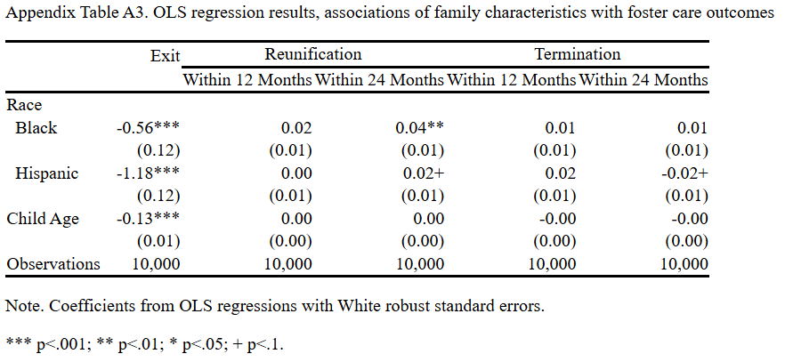 Appendix Table A3. OLS regression results, associations of family characteristics with foster care outcomes