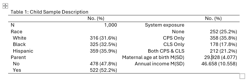 This is a classic table of descriptive statistics, usually “Table 1” in your paper. Note that it contains both categorical variables (also known as factor variables) and quantitative variables. For the categorical variables, it gives frequencies and percentages for each category, or level. For the continuous variable it gives the mean and standard deviation, as indicated by M(SD)